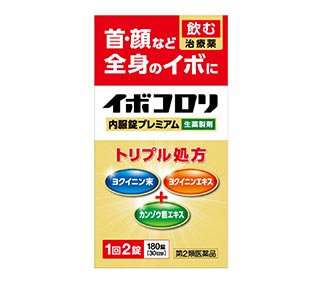 「ヨクイニンエキス」「ヨクイニン末」「カンゾウ粗エキス」のトリプル処方。1回2錠と飲みやすい。